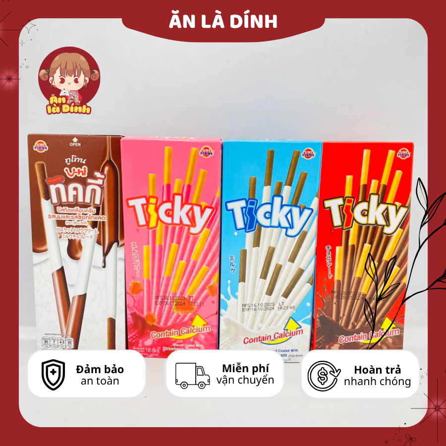 Giòn tan, béo ngậy, thơm ngon! Bánh Que Ticky Thái Lan 20g là lựa chọn hoàn hảo cho những buổi chiều thèm đồ ăn vặt. Với 3 hương vị ngon miệng: socola, sữa và dâu, bạn sẽ có nhiều lựa chọn để thỏa mãn cơn thèm của mình. Mỗi que bánh đều được phủ lớp kem bơ sữa hoặc socola ngọt ngào, tạo nên sự kết hợp tuyệt vời giữa vị ngọt, béo và giòn tan.